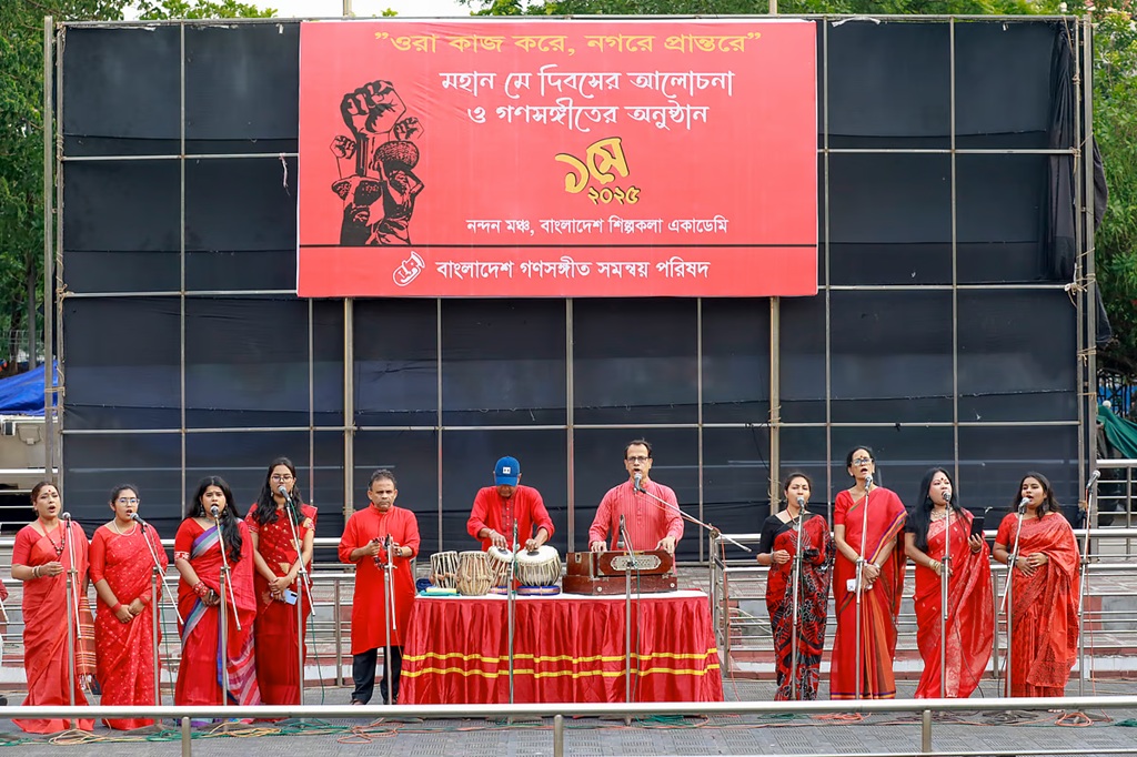 দিবসটি উপলক্ষে বিকেল পাঁচটায় শিল্পকলা একাডেমির উন্মুক্ত নন্দন মঞ্চে আলোচনা ও গণসংগীত অনুষ্ঠানের আয়োজন করা হয়। অনুষ্ঠানে সভাপতিত্ব করেন সংগঠনের সভাপতি শিল্পী কাজী মিজানুর রহমান। আলোচনা করেন সহসভাপতি শিল্পী ফকির সিরাজ ও সাধারণ সম্পাদক মানজার চৌধুরী। মে দিবসের তাৎপর্য তুলে ধরে আলোচনায় বক্তারা জীবন ধারণের জন্য শ্রমিকদের ন্যূনতম মজুরি নিশ্চিতের দাবি জানান। পরে ছিল ‘ওরা কাজ করে, নগরে বন্দরে’ শীর্ষক সাংস্কৃতিক অনুষ্ঠান। দলীয় ও একক শিল্পীদের গণসংগীত, নৃত্য ও আবৃত্তি দিয়ে সাজানো হয়েছিল মেহনতি মানুষের মুক্তির প্রত্যয়দীপ্ত এই অনুষ্ঠান।