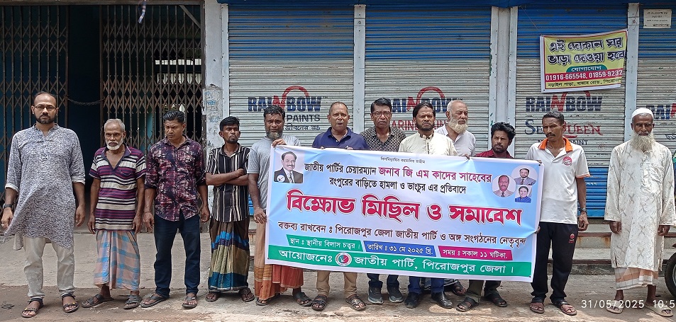 জিএম কাদেরের বাড়িতে হামলার প্রতিবাদে পিরোজপুরে জাতীয় পার্টির বিক্ষোভ সমাবেশ